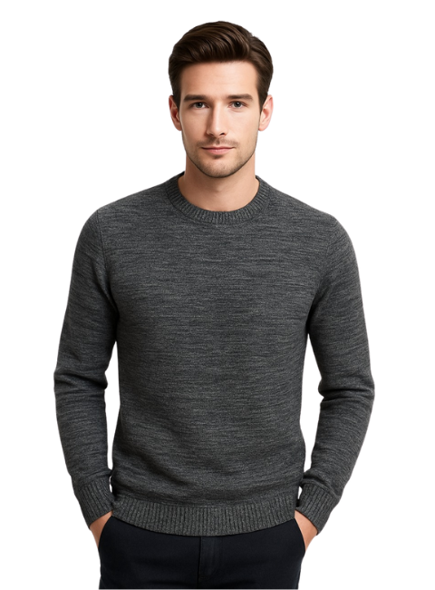 A soft, heather-textured knit sweater designed for everyday comfort and durability. Features a clean back profile with fine stitching and ribbed finishing for a premium look.