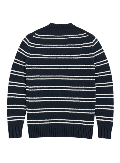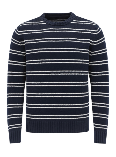 A soft and warm navy sweater with classic horizontal stripes, perfect for everyday winter wear. It offers a comfortable fit, ribbed hems, and a timeless style that pairs easily with any casual or semi-casual look.