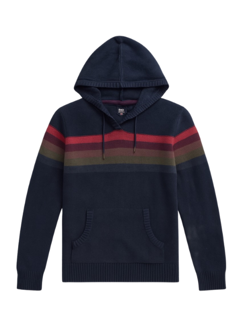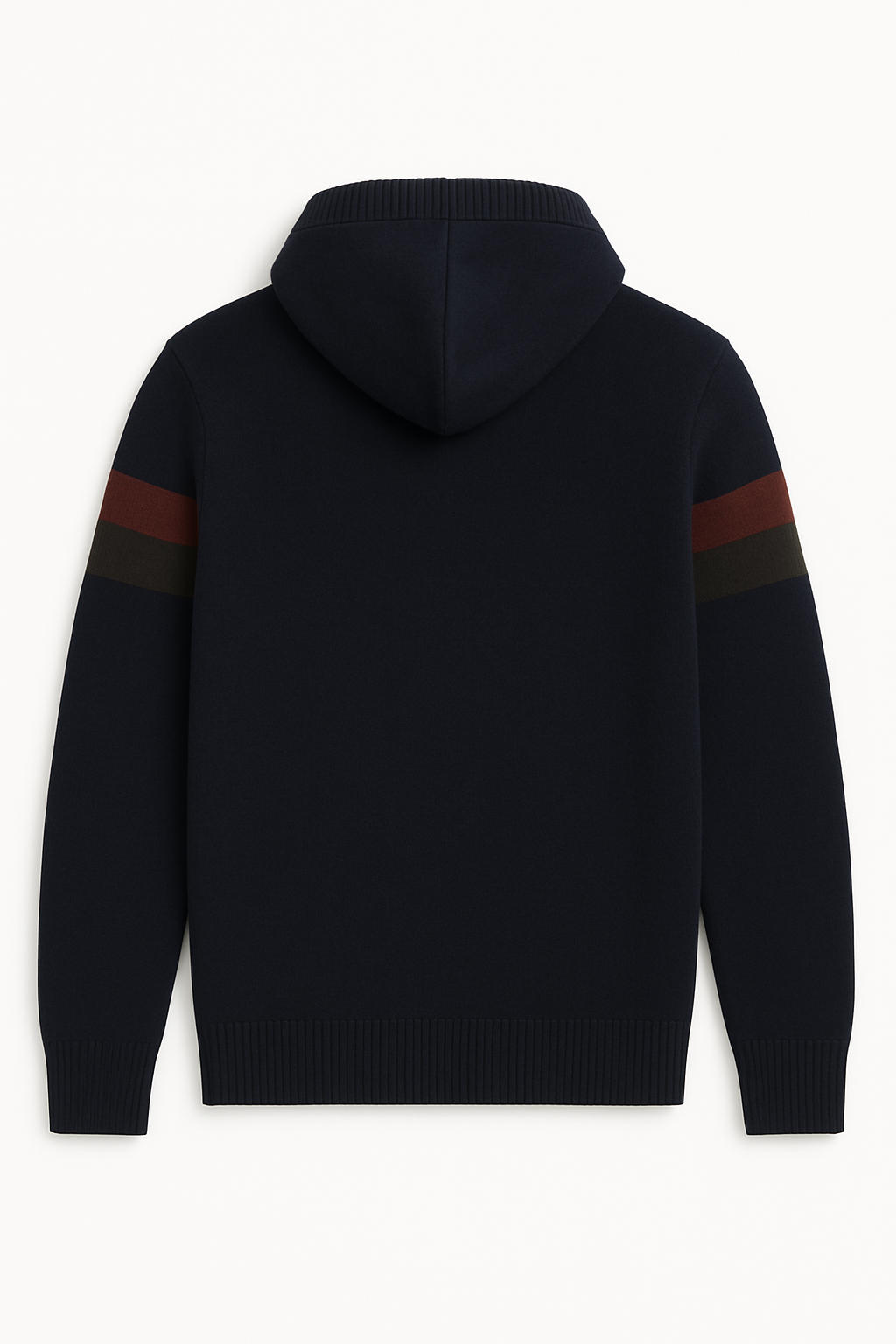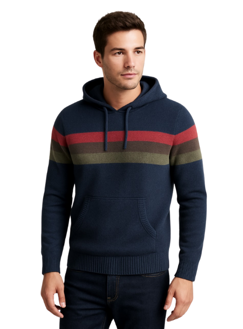 A high-quality, soft knit hoodie featuring multicolor chest stripes and a modern, comfortable fit. Perfect for casual wear with durable stitching and a stylish, versatile design.
